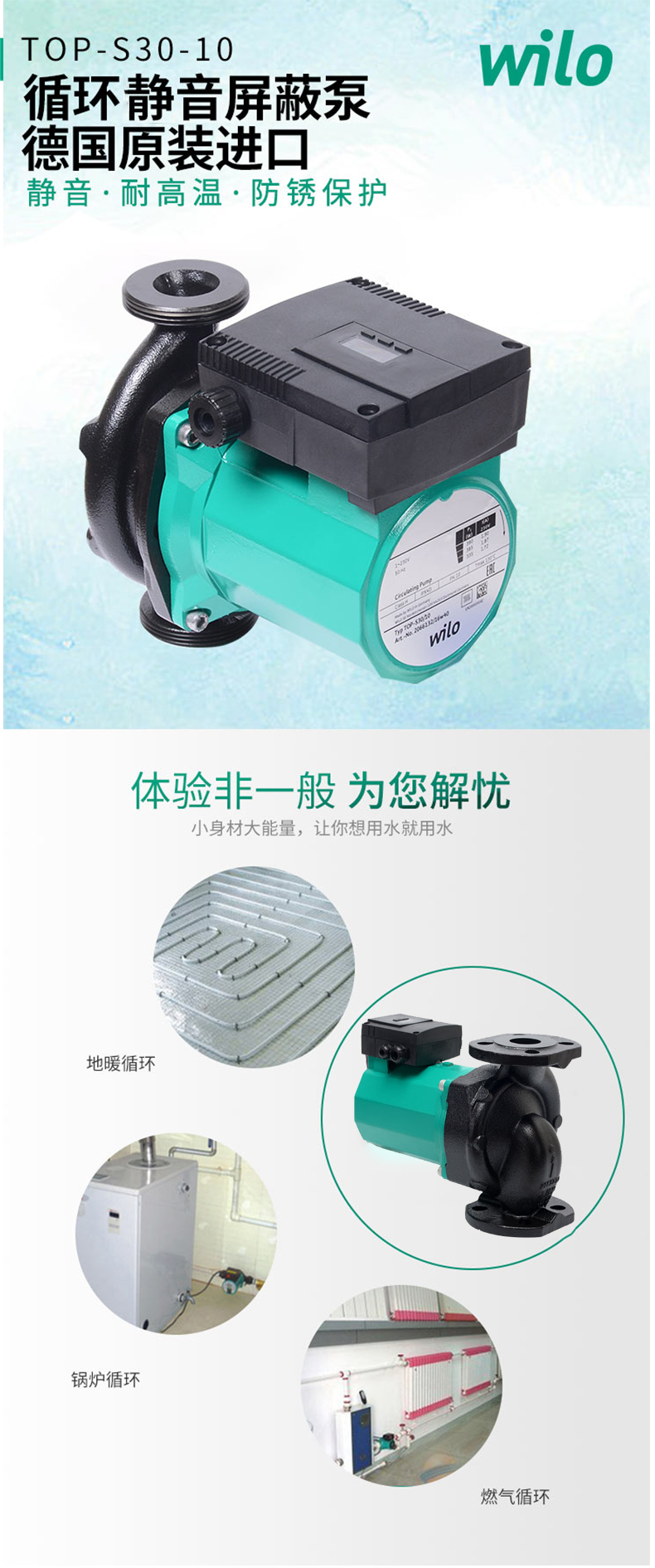 德国原装进口,耐温130℃,适用于350-1200m2别墅地暖循环,广泛用于采暖、空调循环,泵体外部带有保暖隔热,三档调速。