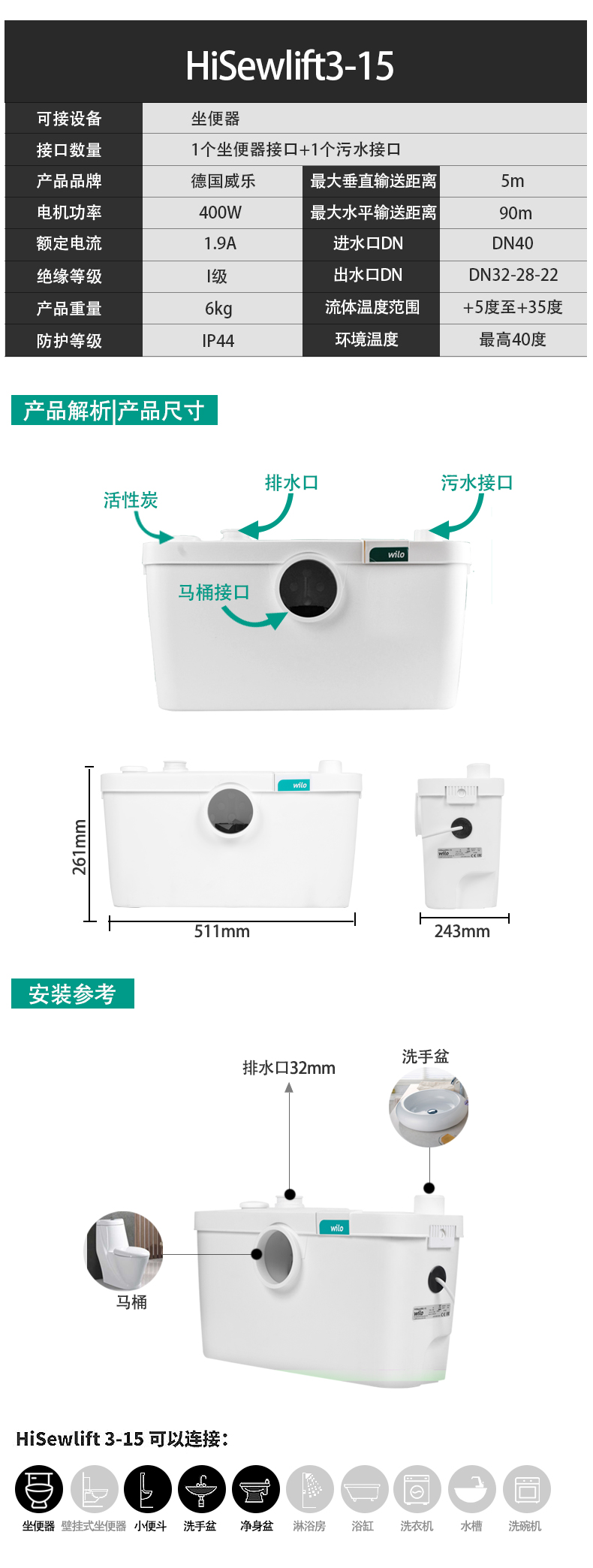 法国原装进口,工程PP外壳,内置不锈钢铰刀,置有活性炭有效防止异味,可接坐便器、洗手盆、淋浴等,适用于洗手间改造需污水提升、排放的场所,多种规格可供选择。