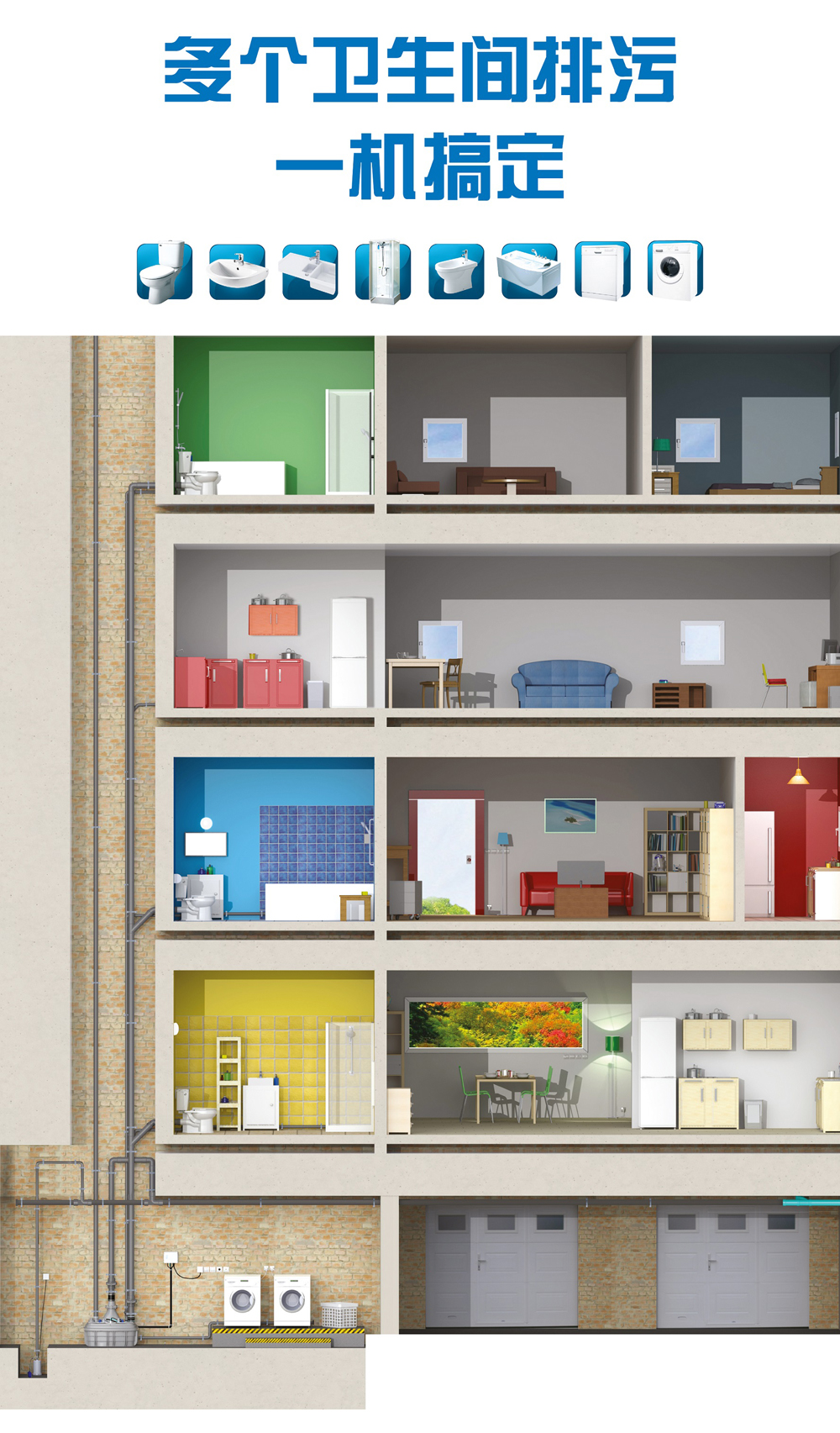 污水提升装置,可以取代传统的污水坑,将地下室中无法自动排出的污废水通过设备进行提升后排到市政管网。